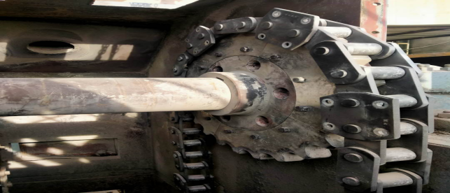 在1909斗提機尾輪、板鏈、料斗及機頭,進行拆除更換。已完成機頭更換。