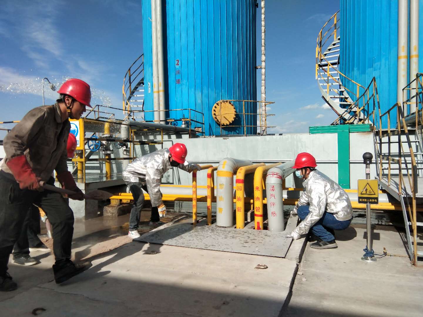 演練以維修工在焊接護欄時將焊渣掉入燃油庫房導流溝引起溝內棉紗著火事故為主題,當班調度接到崗位人員匯報后組織義務消防員對油罐、回油、來油、再循環管道進行降溫,并匯報公司啟動應急處置預案進行滅火的事故處置演練過程。