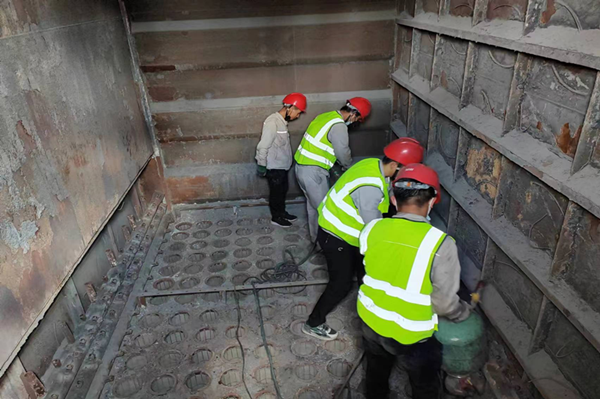 脫硫塔檢修現場,塔內料液堆積多,空間小,清理難度大,只能用小推車一車一車的拉運到人孔門,再一鍬一鍬的鏟上鏟車,工作量非常大,只有熱力裝置的人很難在檢修時間內完成料液清理工作。公司總經理、副經理守在現場,協調各科室、裝置人員協助清理,兩天兩夜沒有間斷,在滿是泥水的脫硫塔內來來回,奔跑了無數次,污泥沾滿了全身每一個地方,不知是汗水還是泥水浸濕了衣服,他們干活不分你我,不惜力氣,相互配合,安全高效的完成了料液清理工作,為下一步脫硫塔消漏、防腐做好鋪墊。