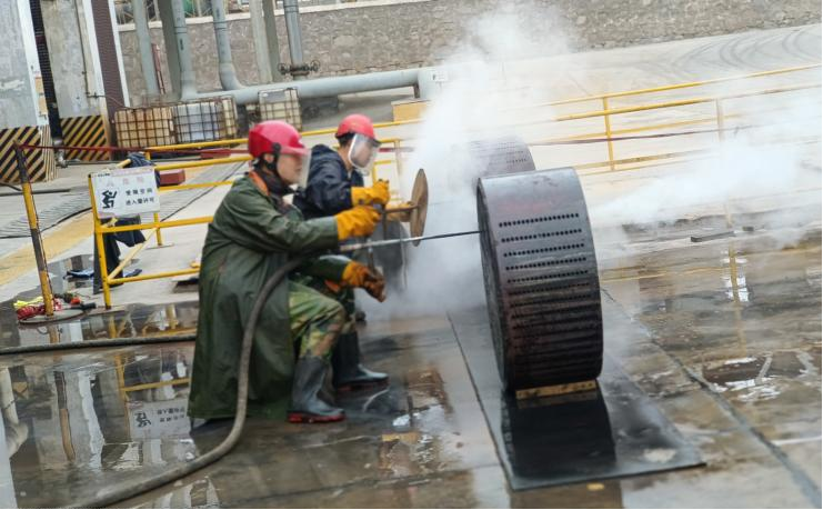 檢修已經是第三天,接近尾聲,大家似乎已經疲憊,但是行動上未松懈。今日的氯化氫小廣場上格外熱鬧,7:20,班長已經開始準備今日的檢修票證,為檢修項目做準備。他的身影在朝陽地映射下顯得那么著急,沒有一點怠慢的意思,今天我們班組檢修的項目是提濃塔再沸器石墨塊疏通工作,這項工作看起來簡單,實際上是耐心地考驗。一個個細小的石墨孔需要用蒸汽一個一個疏通,檢修開始之前還是和往常一樣,安全教育是少不了的,班長一遍遍強調防護用品規(guī)范佩戴以及疏通過程中的安全注意事項,在準備工作結束后,今天的檢修工作開始了。