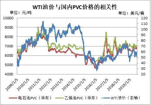 國內(nèi)PVC的生產(chǎn)工藝主要有兩種。一是電石法,主要生產(chǎn)原料是電石、煤炭和原鹽;二是乙烯法,主要原料是石油。國際市場上PVC的生產(chǎn)以乙烯法為主,而國內(nèi)受富煤、貧油、少氣的資源稟賦限制,則以電石法為主。截至2018年底,國內(nèi)PVC產(chǎn)能為2404萬噸,其中電石法PVC產(chǎn)能為1962萬噸,乙烯法PVC產(chǎn)能為442萬噸,電石法產(chǎn)能和乙烯法產(chǎn)能的占比分別為81.6%和18.4%。由于電石法PVC占據(jù)主導地位,原油價格的變化對國內(nèi)PVC影響較小。統(tǒng)計顯示,2009年1月至2019年11月,華東市場電石法PVC和乙烯法PVC與WTI油價的相關系數(shù)分別為0.42和0.51,相關性并不高。