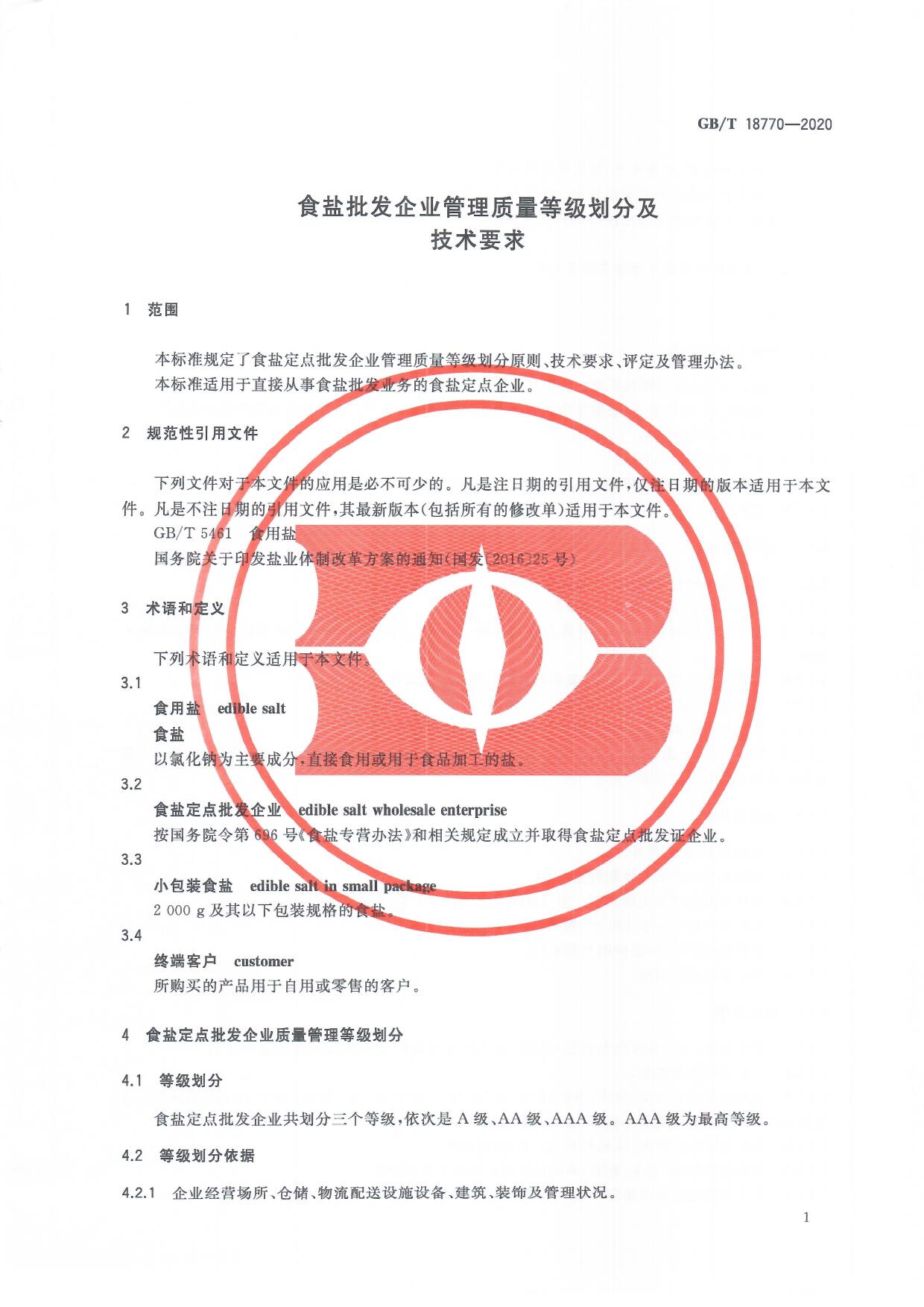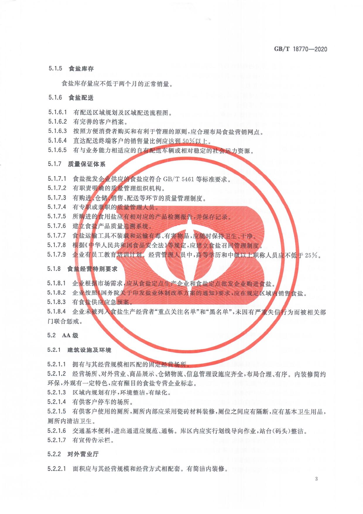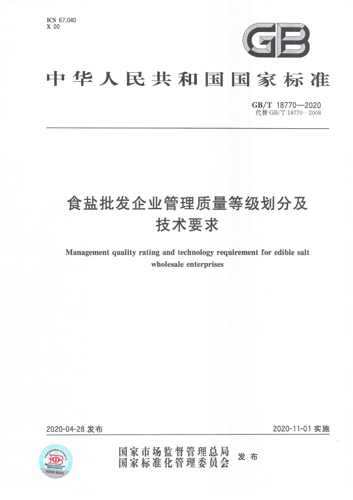 食鹽批發企業管理質量等級劃分及技術要求(GB/T 18770-2020)