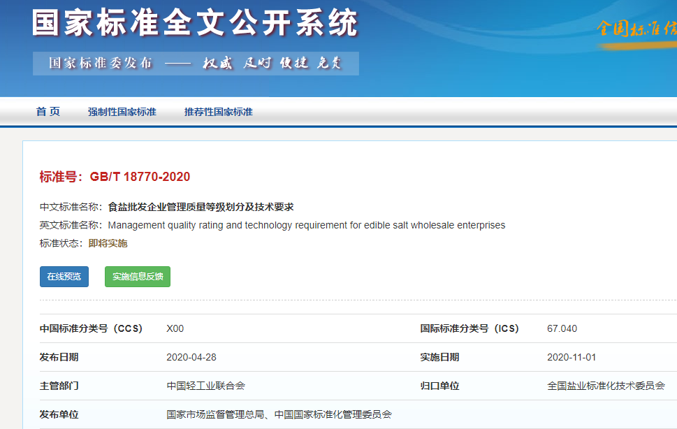 GB/T18770-2020標準今年11月1日實施在即,需要明白的是當由食鹽定點批發點企業自律實施,涉及標準與鹽改方案、部委《通知》及省鹽業主管部門實施文件抵觸的疑慮或問題,可以根據規范效力原則適用并按規定渠道反映。