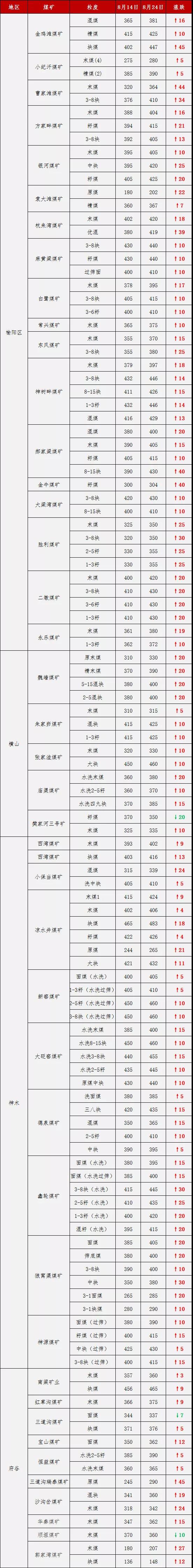 8月14日-8月24日各煤礦價格累計上漲表格: