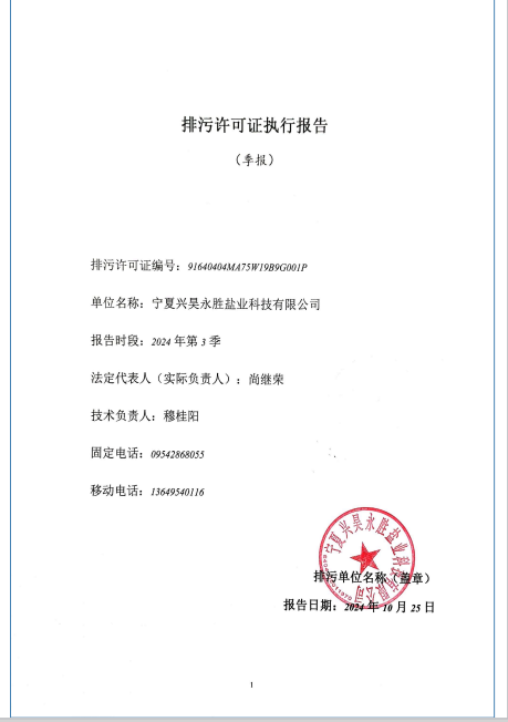 寧夏興昊永勝鹽業科技有限公司2024年第3季度排污許可執行報告